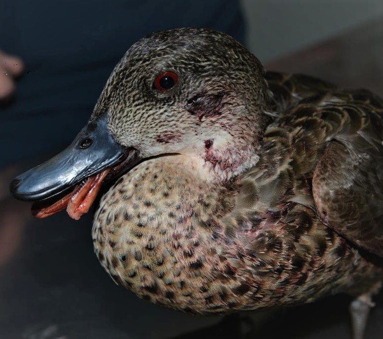 Just hours before the season ended, rescuers found this Pink-eared Duck which had been shattered by shotgun pellets and left to die.